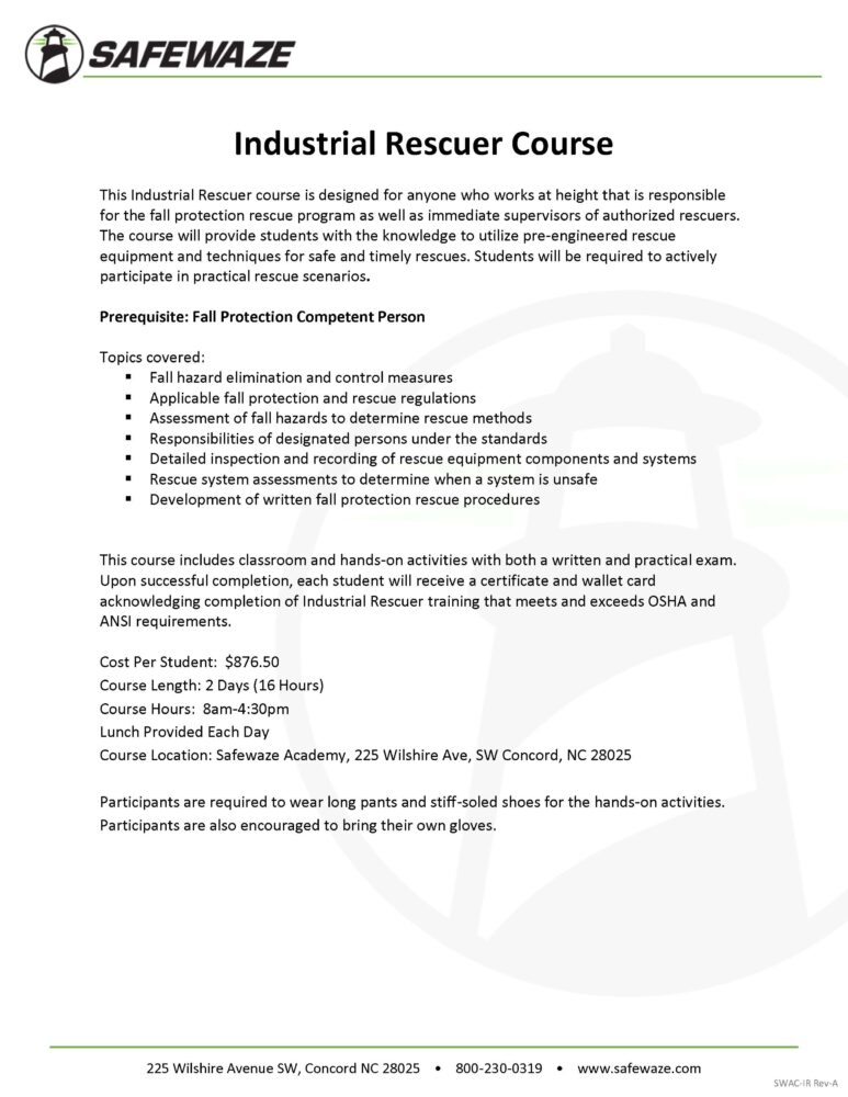 This Industrial Rescuer course is designed for anyone who works at height that is responsible for the fall protection rescue program as well as immediate supervisors of authorized rescuers. The course will provide students with the knowledge to utilize pre-engineered rescue equipment and techniques for safe and timely rescues. Students will be required to actively participate in practical rescue scenarios.