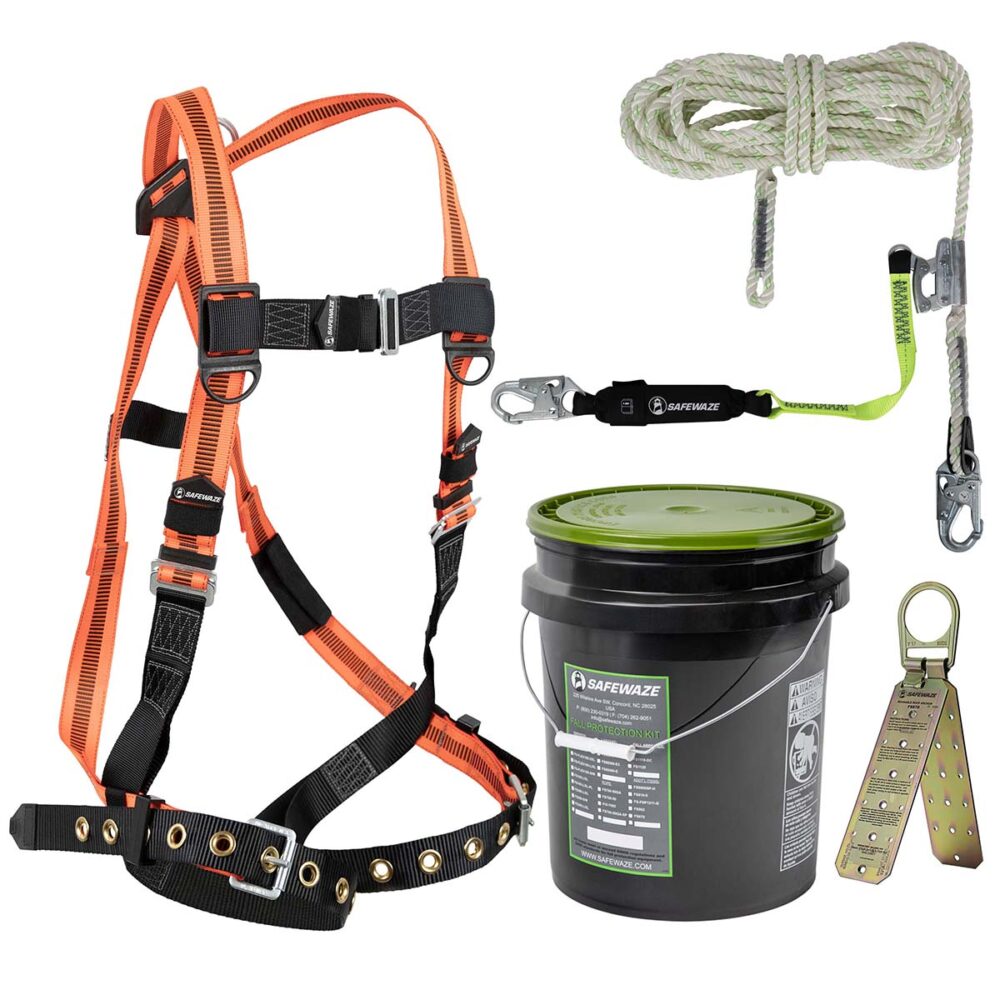 An economy collection of materials for roofing – harness, lifeline and anchor – conveniently packaged in a durable plastic bucket with lid.